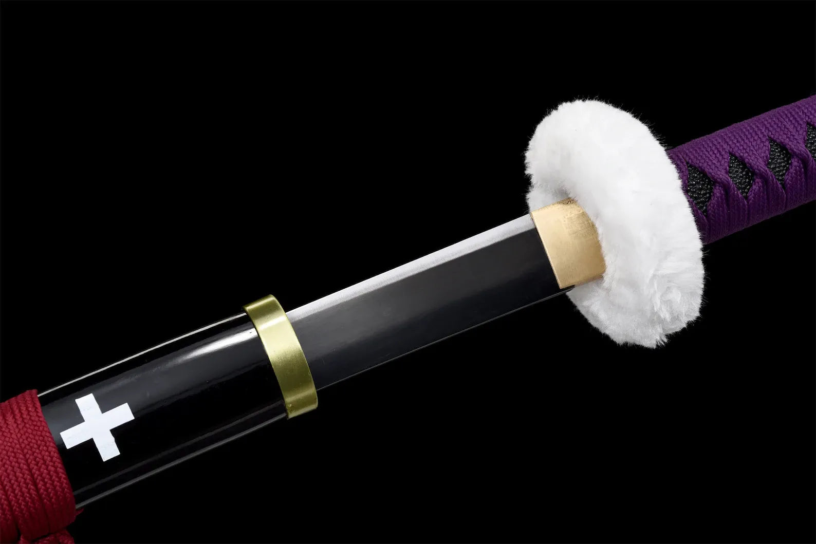 Le Kikoku fait partie des épées les plus distinctives de One Piece, et cette réplique capture chaque détail emblématique. De la garde blanche et duveteuse (tsuba) au saya noir brillant orné de croix blanches, elle reflète l’esthétique minimaliste et clinique de Law. La lame est forgée en acier 1060 à haute teneur en carbone, trempée pour la solidité et la résilience. Bien que non affûtée pour des raisons de sécurité, elle conserve le poids, la courbure et l’équilibre corrects d’un véritable nodachi prêt au combat.