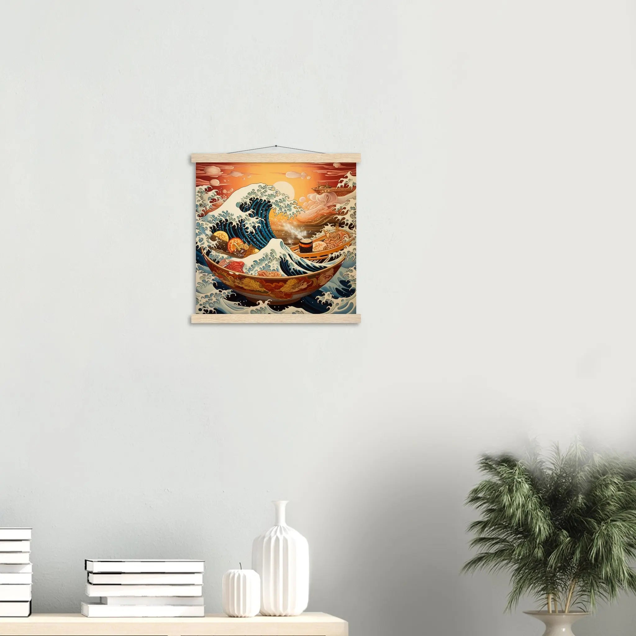 La peinture japonaise et son impression très créative sont parfaites pour votre intérieur et une décoration élégante. Sur cette peinture, la célèbre vague de Kanagawa a été schématisée pour tenir dans un délicieux bol de Ramen ! On retrouve ici deux icônes japonaises emblématiques pour une décoration murale unique qui peut orner n'importe quelle pièce dans son intégralité tout en conservant un petit côté sobre.