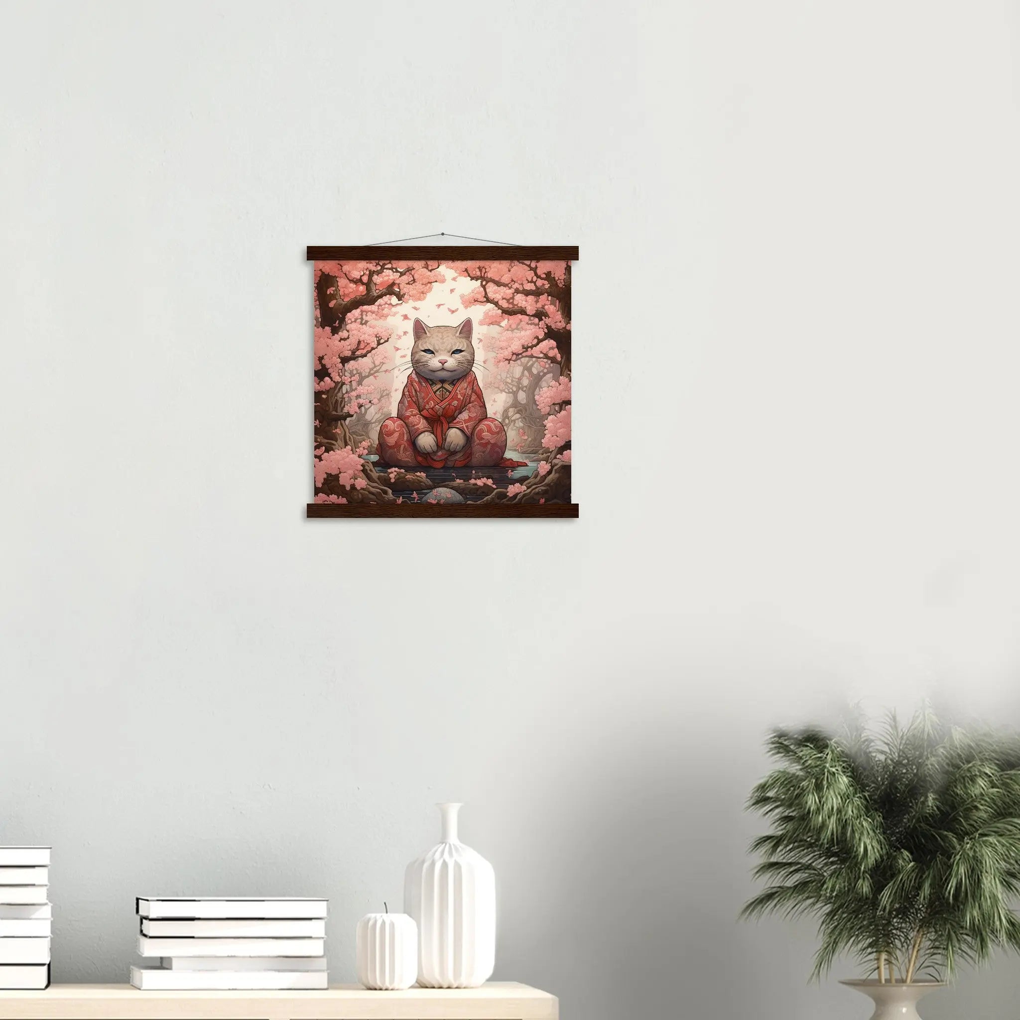 Avec ses couleurs vives et son design original, cette peinture japonaise est le complément parfait de toute pièce de votre maison. Le chat vêtu d'une veste de kimono tient une épée entre ses dents comme s'il était prêt à se battre ! Vous trouverez cette toile en plusieurs tailles et styles donc peu importe où vous voulez placer votre votre déco japonaise (sur votre mur près de la télévision peut-être ?), il y aura de la place pour eux.