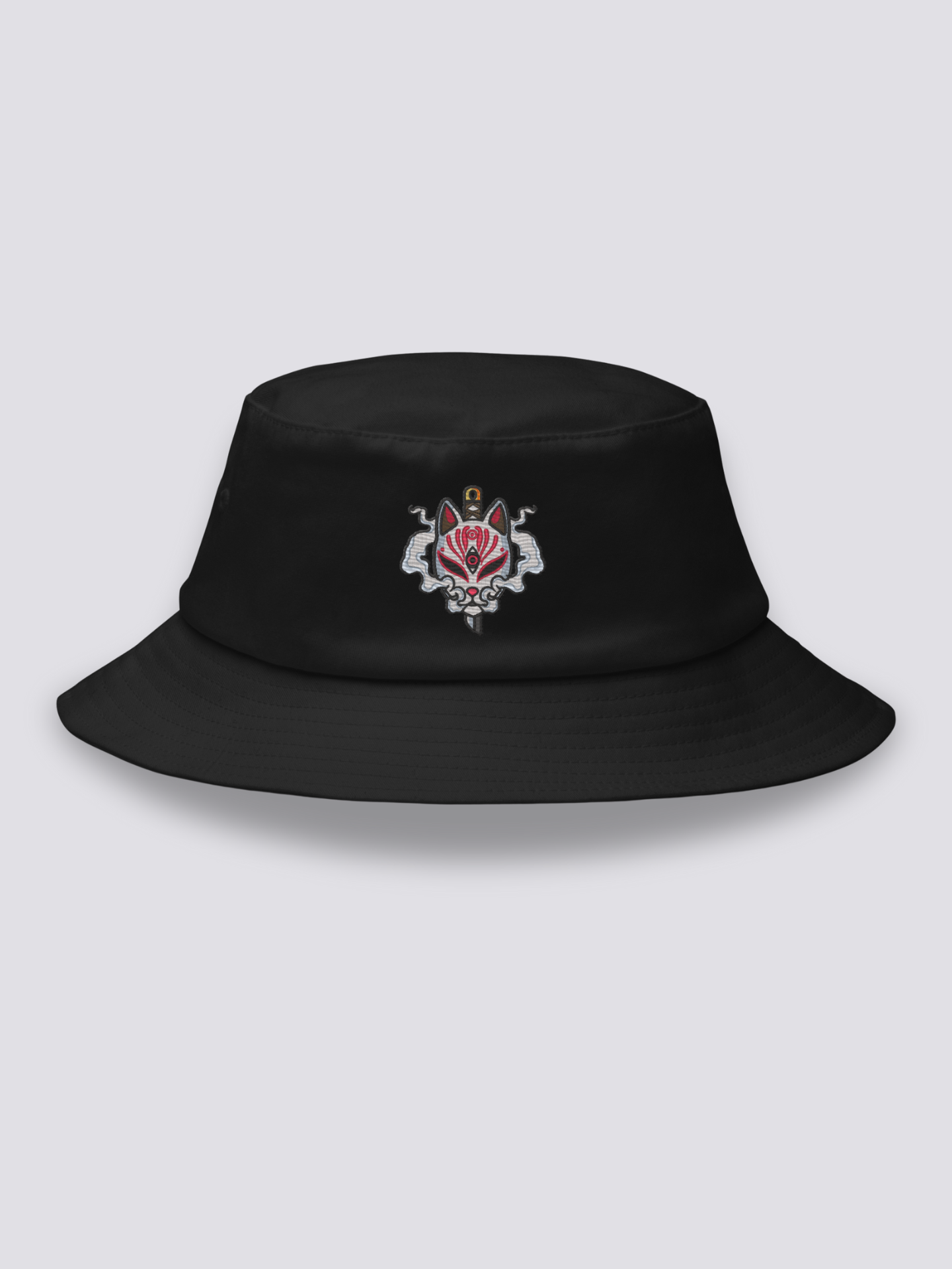 Ce bob noir arbore une broderie saisissante inspirée du kitsune, messager mystique entre les mondes. Emblème de vigilance et de transformation, ce renard japonais semble nous rappeler que toute lumière vient d’en haut. Une touche d’ésotérisme japonais au service d’un style sobre et profond.